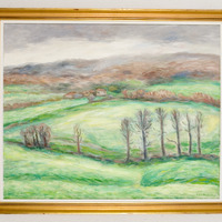 En primeiro plano prados resoltos a base de degradación de tons verdes e unha ringleira de árbores de cor marrón. En segundo plano, no centro, un grupo de casas en tonalidades marróns e, ao fondo, montañas de suaves lombas.