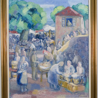 Obra de formato rectangular. Escena da vida cotiá no mundo rural galego que representa un mercado ateigado de xente.