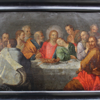 Óleo sobre cobre que representa a Última Cea. Asume a noción iconográfica da mesa rectangular e a disposición escorzada dos comensais do primeiro plano, co traidor Xudas como introdutor da escena, identificable co atributo da bolsa de moedas que porta na destra e o feito de ir vestido de amarelo, cor dos celos, acompañado por un manto vermello, cor do pecado, mesma tonalidade dos seus cabelos. Repite o tópico do apóstolo Xoán durmido, apoiado no ombreiro de Xesús, reminiscencia das composturas dos triclinia clásicos. Marco liso en madeira ebonizada. Trátase dunha copia fiel do gravado orixinal de Jan Sadeler a partir dun deseño de Peter de Witte (Pedro Cándido ou Pedro o Branco, 1548-1628), de cara os anos 1570-1600 que alcanzou ampla difusión. É salientábel o cromatismo romanista, brillante de verdes, amarelos e vermellos presentes nos mantos que difiren da versión en lenzo do mesmo tema pintada polo mestre de Bruxas. A presenza dun probábel cuit sobre a bandexa, no canto do año da fonte orixinal, podería suxerir a orixe vicerreinal, peruana desta pintura.