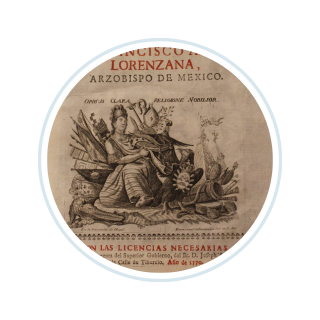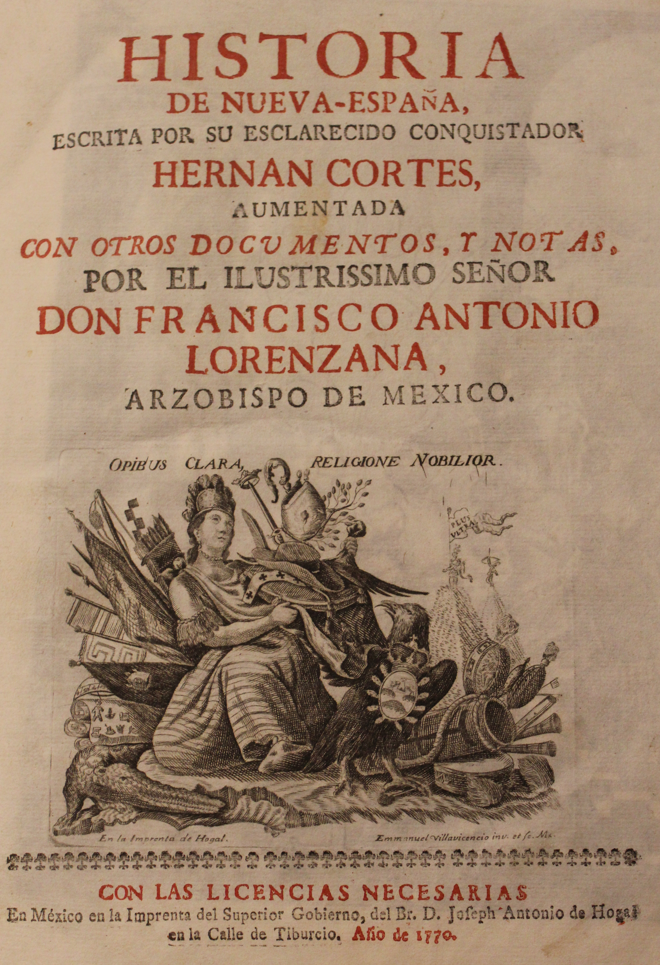 Francisco Antonio de Lorenzana y Butrón, arcebispo de México entre 1766 e 1771 escribiu a Historia de Nueva España o ano 1770. Trátase da primeira edición colonial das Cartas de Relación de Hernán Cortés. O gravado da portada, do calcógrafo Manuel Villavicencio, é unha alegoría: A Nova España, personificada nunha muller nobre, arrodeada de armas e códices mexicas. No seu brazo esquerdo repousan os elementos da conquista: a espada e os símbolos da relixión católica (báculo, mitra…). No fondo, sobre unha cúpula, un soldado español triunfante cun pendón co lema Plus Ultra; atrás, apenas visíbel, o imperio mexica representado cun indíxena que apunta co seu arco cara o ceo. No primeiro plano, a aguia mexica resume a mensaxe da composición: carga nas costas co escudo da Nueva España, orlado cos artellos de nopal. Namentres, unha serpe fuxe da escena.