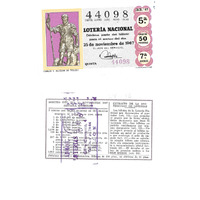 - Décimo da Lotaría Nacional de 1967 co motivo "A Escultura española": imaxe da escultura de Carlos V do Alcázar de Toledo. O número do décimo é o 44098 / ANVERSO. Impresión / 44098 / Lotería Nacional / Décima parte del billete para el sorteo del día 25 de noviembre de 1967 / El jefe del servicio (sinatura). / Quinta / 44098 / 33/67 / 5ª / Precio 50 pesetas / 7ª serie / Carlos V. Alcázar de Toledo (imaxe). / Fca. Nal. de Moneda y Timbre. / REVERSO. Impresión / Sorteo del día 25 de noviembre de 1967. Sistema moderno. 7 series con 60.000 billetes de 500 pesetas. (Resumo de premios). / Extracto de la instrucción de Loterías (texto). / Próximo sorteo: 5 de diciembre. Billetes de 500 ptas., en décimos de 50 ptas