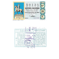 - Décimo da Lotaría Nacional de 1967 co motivo "A Escultura española": imaxe da estatua de Pizarro en Trujillo. O número do décimo é o 50135 / ANVERSO. Impresión / 50135 / Lotería Nacional / Décima parte del billete para el sorteo del día 15 de diciembre de 1967 / El jefe del servicio (sinatura) / Sexta / 50135 / 35/67 / 6ª / Precio 50 pesetas / 4ª serie / Estatua de Pizarro. Trujillo (imaxe). / Fca. Nal. de Moneda y Timbre / REVERSO. Impresión. / Sorteo del día 15 de diciembre de 1967. Sistema moderno. 6 series de 80.000 billetes de 50 pesetas. (Resumo de premios). / Extracto de la instrucción de Loterías (texto). / Próximo sorteo: 22 de diciembre. Billetes de 10.000 ptas., en décimos de 1.000 ptas