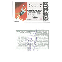 - Décimo da Lotaría Nacional de 1968 co motivo "Os deportes": imaxe dun xogador de balonmán. O número do décimo é o 56117 / ANVERSO. Impresión / 56117 / Lotería Nacional. Décima parte del billete para el sorteo del día 25 de marzo de 1968. / El jefe del servicio (sinatura). / Séptima / 56117 / 9/68 / 7ª / Precio 50 pesetas / 2ª serie / Balonmano (imaxe). / Fca. Nal. de Moneda y Timbre. / REVERSO. Impresión. / Sorteo del día 25 de marzo 1968. Sistema tradicional. 9 series de 60.000 billetes de 500 pesetas. (Resumo de premios). / Extracto de la instrucción de Loterías (texto). / Próximo sorteo: 5 de abril. Billetes de 1.000 ptas., en décimos de 100 ptas