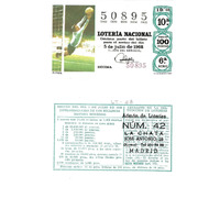 - Décimo da Lotaría Nacional de 1968 co motivo "Os deportes": imaxe dun porteiro de fútbol. O número do décimo é o 50895 / ANVERSO. Impresión. / 50895 / Lotería Nacional. Décima parte del billete para el sorteo del día 5 de julio de 1968. / El jefe del servicio (sinatura). / Décima / 50895 / 19/68 / 10ª / Precio 100 pesetas / 6ª serie / Fútbol (imaxe). / Fca. Nal. de Moneda y Timbre / REVERSO. Impresión. / Sorteo del día 5 de julio de 1968. Extraordinario de los millones. Sistema moderno. 8 series de 70.000 billetes de 1.000 pesetas. (Resumo de premios). / Extracto de la instrucción de Loterías (texto). / Próximo sorteo: 15 de julio. Billetes de 500 ptas., en décimos de 50 ptas