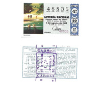 - Décimo "Especial de Vacacións" da Lotaría Nacional de 1968 co motivo "Os deportes": imaxe duns deportistas facendo piragüismo. O número do décimo é o 48835 / ANVERSO. Impresión / 48835 / Lotería Nacional. Décima parte del billete para el sorteo del día 5 de agosto de 1968 / El jefe del servicio (sinatura). / Cuarta / 48835 / 22/68 / 4ª / Precio 50 pesetas / 1ª serie / Piragüismo (imaxe). / Fca. Nal. de Moneda y Timbre / REVERSO. Impresión. / Sorteo del día 5 de agosto de 1968. Especial de vacaciones. Sistema moderno. 7 series de 100.000 billetes de 500 pesetas. (Resumo de premios) / Extracto de la instrucción de Loterías (texto) / Próximo sorteo: 16 de agosto. Billetes de 500 ptas., en décimos de 50 ptas