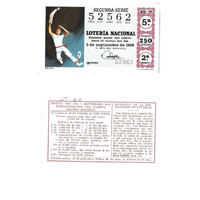 - Décimo "Extraordinario do Turista" da Lotaría Nacional de 1968 co motivo "Os deportes": imaxe dun xogador de pelota. O número do décimo é o 52562 / ANVERSO. Impresión. / SEGUNDA SERIE / 52562 / Lotería Nacional. Décima parte del billete para el sorteo del día 5 de septiembre de 1968. / El jefe del servicio (sinatura). / Quinta / 52562 / 25/68 / 5ª / Precio 250 pesetas / 2ª serie / Pelota (imaxe). / Fca. Nal. de Moneda y Timbre. / REVERSO. Impresión. / Sorteo del día de 5 septiembre 1968. Extraordinario del turista. Sistema moderno. 10 series de 60.000 billetes de 2.500 pesetas. (Resumo de premios). / Extracto de la instrucción de Loterías (texto). / Próximo sorteo: 16 de septiembre. Billetes de 500 ptas., en décimos de 50 ptas