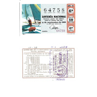 - Décimo da Lotaría Nacional de 1968 co motivo "Os deportes": imaxe duns barcos de vela. O número do décimo é o 64758 / ANVERSO. Impresión / 64758 / Lotería Nacional. Décima parte del billete para el sorteo del día 16 de septiembre de 1968 / El jefe del servicio (sinatura) / Sexta / 64758 / 26/68 / 6ª / Precio 50 pesetas / 6ª serie / Vela (imaxe). / Fca. Nal. de Moneda y Timbre. / REVERSO. Impresión. / Sorteo del día 16 de septiembre 1968. Sistema moderno. 8 series de 80.000 billetes de 500 pesetas. (Resumo de premios). / Extracto de la instrucción de Loterías (texto). / Próximo sorteo: 25 de septiembre. Billetes de 500 ptas., en décimos de 50 ptas