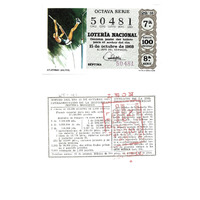 - Décimo da Lotaría Nacional de 1968 "Extraordinario da Hispanidade" co motivo "Os deportes": imaxe dun deportista practicando atletismo (saltos). O número do décimo é o 50481 / ANVERSO. Impresión / OCTAVA SERIE / 50481 / Lotería Nacional. Décima parte del billete para el sorteo del día 15 de octubre de 1968. / El jefe del servicio (sinatura). / Séptima / 50481 / 29/68 / 7ª / Precio 100 pesetas / 8ª serie / Atletismo (saltos) (imaxe). / Fca. Nal. de Moneda y Timbre. / REVERSO. Impresión. / Sorteo del día 15 de octubre 1968 extraordinario de la Hispanidad. Sistema moderno. 8 series de 80.000 billetes de 1.000 pesetas. (Resumo de premios). / Extracto de la instrucción de Loterías (texto). / Próximo sorteo: 25 de octubre. Billetes de 500 ptas., en décimos de 50 ptas