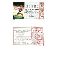 - Décimo da Lotaría Nacional de 1968 co motivo "Os deportes": imaxe dun xogador practicando rugby. O número do décimo é o 46605 / ANVERSO. Impresión / 46605 / Lotería Nacional. Décima parte del billete para el sorteo del día 25 de noviembre de 1968. / El jefe del servicio (sinatura). / Sexta / 46605 / 33/68 / 6ª / Precio 50 pesetas / 6ª serie / Rugby (imaxe) / Fca. Nal. de Moneda y Timbre. / REVERSO. Impresión. / Sorteo del día 25 noviembre 1968. Sistema moderno. 9 series de 60.000 billetes de 500 pesetas. (Resumo de premios). / Extracto de la instrucción de Loterías (texto). / Próximo sorteo: 5 de diciembre. Billetes de 500 ptas., en décimos de 50 ptas