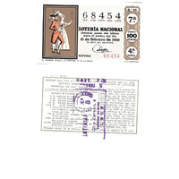 - Décimo "Especial de San Valentín" da Lotería Nacional de 1969 co motivo "O refraneiro": imaxe representando o refrán "Al hombre osado, la fortuna le da la mano". O número do billete é o 68454 / ANVERSO. Impresión / 68454 / Lotería Nacional. Décima parte del billete para el sorteo del día 15 de febrero de 1969. / El jefe del servicio (sinatura). / Séptima / 68454 / 5/69 / 7ª / Precio 100 pesetas / 4ª serie / Al hombre osado, la fortuna le da la mano (refrán, imaxe). / Fca. Nal. de Moneda y Timbre / REVERSO. Impresión. / Sorteo del día 15 febrero de 1969. Sistema moderno. Especial de San Valentín. 4 series de 100.000 billetes de 1.000 pesetas. (Resumo de premios). / Extracto de la instrucción de Loterías (texto). / Próximo sorteo: 25 de febrero. Billetes de 500 ptas., en décimos de 50 ptas