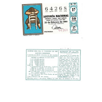 - Décimo da Lotaría Nacional de 1969 co motivo "O refraneiro": imaxe representando o refrán "Pereza, llave de pobreza". O número do décimo é o 64268 / ANVERSO. Impresión. / 64268 / Lotería Nacional. Décima parte del billete para el sorteo del día 25 de febrero de 1969. / El jefe del servicio (sinatura). / Primera / 64268 / 6/69 / 1ª / Precio 50 pesetas / 1ª serie / Pereza, llave de la pobreza (refrán, imaxe). / Fca. Nal. de Moneda y Timbre / REVERSO. Impresión. / Sorteo del día 25 febrero de 1969. Sistema moderno. 9 series de 80.000 billetes de 500 pesetas. (Resumo de premios). / Extracto de la instrucción de Loterías (texto). / Próximo sorteo: 4 de marzo. Billetes de 1.000 ptas., en décimos de 100 ptas