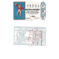 - Décimo da Lotaría Nacional de 1969 co motivo "O refraneiro": imaxe representando o refrán "De do sacas y no pon, hallarás el hondón". O número do décimo é o 39052 / ANVERSO. Impresión / 39052 / Lotería Nacional. Décima parte del billete para el sorteo del día 25 de marzo de 1969. / El jefe del servicio (sinatura). / Primera / 39052 / 9/69 / 1ª / Precio 50 pesetas / 11ª serie / De do sacas y no pon, hallarás el hondón (refrán, imaxe). / Fca. Nal. de Moneda y Timbre / REVERSO. Impresión. / Sorteo del día 25 de marzo de 1969. Sistema tradicional. 11 series de 60.000 billetes de 500 pesetas. (Resumo de premios). / Extracto de la instrucción de Loterías (texto). / Próximo sorteo: 8 de abril. Billetes de 2.500 ptas., en décimos de 250 ptas