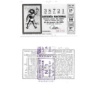 - Décimo da Lotaría Nacional de 1969 co motivo "O refraneiro": imaxe que representa o refrán "Más vale pájaro en mano que ciento volando". O número do décimo é o 38721 / ANVERSO. Impresión / 38721 / Lotería Nacional. Décima parte del billete para el sorteo del día 16 de mayo de 1969. / El jefe del servicio (sinatura) / Primera / 38721 / 14/69 / 1ª / Precio 50 pesetas / 3ª serie / Más vale pájaro en mano que ciento volando (refrán, imaxe). / Fca. Nal. de Moneda y Timbre / REVERSO. Impresión. / Sorteo del día 16 de mayo de 1969. Sistema moderno. 8 series de 80.000 billetes de 500 pesetas. (Resumo de premios). / Extracto de la instrucción de Loterías (texto). / Próximo sorteo: 27 de mayo. Billetes de 500 ptas., en décimos de 50 ptas