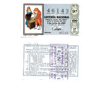 - Décimo "Extraordinario dos Millóns" da Lotaría Nacional de 1969 co motivo "O refraneiro": imaxe que representa o refrán "Dinero llama a dinero". O número do décimo é o 46143 / ANVERSO. Impresión. / 46143 / Lotería Nacional. Décima parte del billete para el sorteo del día 5 de julio de 1969. / El jefe del servicio (sinatura). Novena / 46143 / 19/69 / 9ª / Precio 100 pesetas / 1ª serie / Dinero llama a dinero (refrán, imaxe). / Fca. Nal. de Moneda y Timbre / REVERSO. Impresión. / Sorteo del día 5 de julio de 1969. Sistema moderno. Extraordinario de los millones. 9 series de 70.000 billetes de 1.000 pesetas. 9 series de 70.000 billetes de 1.000 pesetas. (Resumo de premios). Extracto de la instrucción de Loterías (texto). / Próximo sorteo: 15 de julio. Billetes de 500 ptas., en décimos de 50 ptas