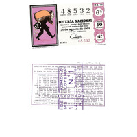 - Décimo da Lotaría Nacional de 1969 co motivo "O refraneiro": imaxe que representa o refrán "La avaricia rompe el saco". O número do décimo é o 48532 / ANVERSO. Impresión. / 48532 / Lotería Nacional. Décima parte del billete para el sorteo del día 26 de agosto de 1969. / El jefe del servicio (sinatura). / Sexta / 48532 / 24/69 / 6ª / Precio 50 pesetas / 4ª serie / La avaricia rompe el saco (refrán, imaxe). / Fca. Nal. de Moneda y Timbre / REVERSO. Impresión. Sorteo del día 26 de agosto de 1969. Sistema moderno. 10 series de 60.000 billetes de 500 pesetas. (Resumo de premios). / Extracto de la instrucción de Loterías (texto). / Próximo sorteo: 5 septiembre. Billetes de 2.500 ptas., en décimos de 250 ptas