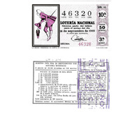 - Décimo da Lotaría Nacional de 1969 co motivo "O refraneiro": imaxe que representa o refrán "La buena presencia es carta de credencia". O número do décimo é o 46320 / ANVERSO. Impresión. / 46320 / Lotería Nacional. Décima parte del billete para el sorteo del día 16 de septiembre de 1969. / El jefe del servicio (sinatura). / Décima / 46320 / 26/69 / 10ª / Precio 50 pesetas / 3ª serie / La buena presencia es carta de credencia (refrán, imaxe). / Fca. Nal. de Moneda y Timbre / REVERSO. Impresión. / Sorteo del día 16 septiembre 1969. Sistema moderno. / 9 series de 80.000 billetes de 500 pesetas. (Resumo de premios). / Extracto de la instrucción de Loterías (texto). / Próximo sorteo: 25 septiembre. Billetes de 500 ptas., en décimos de 50 ptas