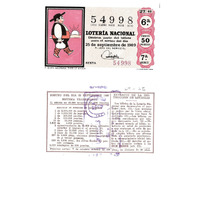 - Décimo da Lotaría Nacional de 1969 co motivo "O refraneiro": imaxe que representa o refrán "A quien madruga, Dios le ayuda". O número do décimo é o 54998 / ANVERSO. Impresión. / 54998 / Lotería Nacional. Décima parte del billete para el sorteo del día 25 de septiembre de 1969. / El jefe del servicio (sinatura). / Sexta / 54998 / 27/69 / 6ª / Precio 50 pesetas / 7ª serie / A quien madrugar, Dios le ayuda (refrán, imaxe). / Fca. Nal. de Moneda y Timbre. / REVERSO. Impresión. / Sorteo del día 25 septiembre 1969. Sistema tradicional. 11 series de 60.000 billetes de 500 pesetas. (Resumo de premios). / Extracto de la instrucción de Loterías (texto). / Próximo sorteo: 7 de octubre. Billetes de 500 ptas., en décimos de 50 ptas