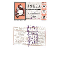 - Décimo da Lotaría Nacional de 1969 co motivo "O refraneiro": imaxe que representa o refrán "Día de mucho, víspera de nada". O número do décimo é o 36594 / ANVERSO. Impresión. / 36594 / Lotería Nacional. Décima parte del billete para el sorteo del día 7 de octubre de 1969. / El jefe del servicio (sinatura). / Décima / 36594 / 28/69 / 10ª / Precio 50 pesetas / 5ª serie / Día de mucho, víspera de nada (refrán, imaxe). / Fca. Nal. de Moneda y Timbre / REVERSO. Impresión. / Sorteo del día 7 de octubre de 1969. Sistema moderno. 12 series de 60.000 billetes de 500 pesetas. (Resumo de premios). / Extracto de la instrucción de Loterías. / Próximo sorteo: 15 de octubre. Billetes de 1.000 ptas., en décimos de 100 ptas