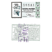 - Décimo da Lotaría Nacional de 1969 co motivo "O refraneiro": imaxe que representa o refrán "Agua pasada no mueve molino". O número do décimo é o 56841 / ANVERSO. Impresión. / 56841 / Lotería Nacional. Décima parte del billete para el sorteo del día 15 de noviembre de 1969. / El jefe del servicio (sinatura). / Primera / 56841 / 32/69 / 1ª / Precio 50 pesetas / 8ª serie / Agua pasada no mueve molino (refrán, imaxe). / Fca. Nal. de Moneda y Timbre / REVERSO. Impresión. / Sorteo del día 15 noviembre 1969. Sistema moderno. 11 series de 60.000 billetes de 500 pesetas. (Resumo de premios). / Extracto de la instrucción de Loterías (texto). / Próximo sorteo: 25 de noviembre. Billetes de 500 ptas., en décimos de 50 ptas