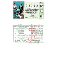 - Décimo da Lotaría Nacional de 1970 co motivo "O mar": imaxe de temática mariñeira que representa a labor da pesca con nasa. O número do décimo é o 38323 / ANVERSO. Impresión. / 38323 / Lotería Nacional. Décima parte del billete para el sorteo del día 27 de enero de 1970. / El jefe del servicio (sinatura). / Quinta / 38323 / 3/70 / 5ª / Precio 50 pesetas / 2ª serie / Pesca con nasa (imaxe). / Fca. Nal. de Moneda y Timbre / REVERSO. Impresión / Sorteo del día 27 de enero de 1970. Sistema moderno. 10 series de 80.000 billetes de 500 pesetas. (Resumo de premios). / Extracto de la instrucción de Loterías (texto). / Próximo sorteo: 5 febrero. Billetes de 500 ptas., en décimos de 50 ptas