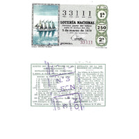- Décimo "Extraordinario de Primavera" da Lotaría Nacional de 1970 co motivo "O mar": imaxe que representa o Buque-Escola Elcano. O número do décimo é o 33111 / ANVERSO. Impresión. / 33111 / Lotería Nacional. Décima parte del billete para el sorteo del día 5 de marzo de 1970. / El jefe del servicio (sinatura). / Primera / 33111 / 7/70 / 1ª / Precio 250 pesetas / 2ª serie / Buque-Escuela Elcano / Fca. Nal. de Moneda y Timbre / REVERSO. Impresión. / Sorteo del día 5 de marzo de 1970. Sistema moderno. Extraordinario de Primavera. 5 series de 60.000 billetes de 2.500 pesetas. (Resumo de premios). / Extracto de la instrucción de Loterías (texto). / Próximo sorteo: 14 de marzo. Billetes de 500 ptas., en décimos de 50 ptas