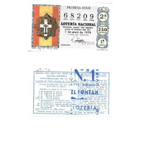 - Décimo "Extraordinario da Paz" da Lotaría Nacional de 1970 co motivo "O mar": imaxe que representa a Gran Cruz ao Mérito Naval. O número do décimo é o 68209 / ANVERSO. Impresión / PRIMERA SERIE / 68209 / Lotería Nacional. Décima parte del billete para el sorteo del día 7 de abril de 1970 / El jefe del servicio (sinatura) / Segunda / 68209 / 10/70 / Precio 250 pesetas / 1ª serie / Gran Cruz al Mérito Naval / Fca. Nal. de Moneda y Timbre / REVERSO. Impresión / Sorteo del día 7 de abril de 1970. Sistema moderno. Extraordinario de la Paz. 5 series de 70.000 billetes de 2.500 pesetas. (Resumo de premios) / Extracto de la instrucción de Loterías (texto) / próximo sorteo: 15 de abril. Billetes de 500 ptas., en décimos de 50 ptas