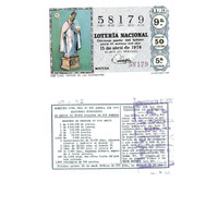 - Décimo da Lotaría Nacional de 1970 co motivo "O mar": imaxe que representa unha figura de "Santo Elmo", patrón dos navegantes. O número do décimo é o 58179 / ANVERSO. Impresión / 58179 / Lotería Nacional. Décima parte del billete para el sorteo del día 15 de abril de 1970 / El jefe del servicio (sinatura) / Novena / 58179 / 11/70 / 9ª / Precio 50 pesetas / 5ª serie / San Elmon, patrón de los navegantes / Fca. Nal. de Moneda y Timbre / REVERSO. Impresión / Sorteo del día 15 de abril de 1970. Sistema moderno. 12 series de 60.000 billetes de 500 pesetas. (Resumo de premios) / Extracto de la instrucción de Loterías (texto) / Próximo sorteo: 25 de abril. Billetes de 500 ptas., en décimos de 50 ptas