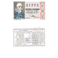 - Décimo da Lotaría Nacional de 1970 co motivo "O mar": imaxe que representa a D. Álvaro de Bazán, militar e almirante español do s. XVI. O número do décimo é o 41904 / ANVERSO. Impresión / 41904 / Lotería Nacional. Décima parte del billete para el sorteo del día 16 de mayo de 1970 / El jefe del servicio (sinatura) / Tercera / 41904 / 14/70 / 3ª / Precio 50 pesetas / 9ª serie / D. Álvaro de Bazán (imaxe) / Fca. Nal. de Moneda y Timbre / REVERSO. Impresión / Sorteo del día 16 de mayo de 1970. Sistema moderno. 10 series de 80.000 billetes de 500 pesetas. (Resumo de premios) / Extracto de la instrucción de Loterías (texto) / Próximo sorteo: 26 de mayo. Billetes de 500 ptas., en décimos de 50 ptas