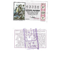 - Décimo "Extraordinario dos Millóns" da Lotaría Nacional de 1970 co motivo "O mar": imaxe que representa unha persoa practicando exploración subacuática. O número do décimo é o 63350 / ANVERSO. Impresión / 63350 / Lotería Nacional. Décima parte del billete para el sorteo del día 7 de julio de 1970 / El jefe del servicio (sinatura) / Segunda / 63350 / 19/70 / 2ª / Precio 250 pesetas / 5ª serie / Exploración subacuática (imaxe) / Fca. Nal. de Moneda y Timbre / REVERSO. Impresión / Sorteo del día 7 de julio de 1970. Sistema moderno. Extraordinario de los millones. 5 series de 70.000 billetes de 2.500 pesetas. (Resumo de premios) / Extracto de la instrucción de Loterías (texto) / Próximo sorteo: 15 de julio. Billetes de 500 ptas., en décimos de 50 ptas