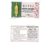 - Décimo da Lotaría Nacional de 1970 co motivo "O mar": imaxe que representa un fanal de Galera Capitana. Un fanal é un farol de gran tamaño que amais de iluminar distinguía as galeras capitanas e patronas, situada na popa e permitía manter o contacto visual nocturno. O número do décimo é o 41901 / ANVERSO. Impresión / 41901 / Lotería Nacional. Décima parte del billete para el sorteo del día 15 de septiembre de 1970 / El jefe del servicio (sinatura) / Séptima / 41901 / 26/70 / 7ª / Precio 50 pesetas / 9ª serie / Fanal de Galera capitana 7 Fca. Nal. de Moneda y Timbre / REVERSO. Impresión / Sorteo del día 15 septiembre 1970. Sistema moderno. 11 series de 80.000 billetes de 500 pesetas. (Resumo de premios) / Extracto de la instrucción de Loterías (texto) / Próximo sorteo: 25 de septiembre. Billetes de 500 ptas., en décimos de 50 ptas