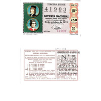 - Décimo "Extraordinario da Hispanidade" da Lotaría Nacional de 1970 co motivo "O mar": imaxe que representa aos irmáns Pinzón, marinos e exploradores españois de finais do s. XV e comezos do XVI. O número do décimo é o 41903 / ANVERSO. Impresión / TERCERA SERIE / 41903 / Lotería Nacional. Décima parte del billete para el sorteo del día 15 de octubre de 1970 / El jefe del servicio (sinatura) / Décima / 41903 / 29/70 / 10ª / Precio 250 pesetas / 3ª serie / Los Hermanos Pinzón (imaxe) / Fca. Nal. de Moneda y Timbre / REVERSO. Impresión / Sorteo del día 15 de octubre de 1970. Sistema moderno. Extraordinario de la Hispanidad. 5 series de 70.000 billetes de 2.500 pesetas. (Resumo de premios) / Extracto de la instrucción de Loterías (texto) / Próximo sorteo: 27 de octubre. Billetes de 500 ptas., en décimos de 50 ptas