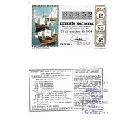 - Décimo da Lotaría Nacional de 1970 co motivo "O mar": imaxe que representa as Tres Carabelas, "La Pinta", "La Niña" e a "Santa María". O número do décimo é o 65852 / ANVERSO. Impresión / 65852 / Lotería Nacional. Décima parte del billete para el sorteo del día 27 de octubre de 1970 / El jefe del servicio (sinatura) / Primera / 65852 / 30/70 / 1ª / Precio 50 pesetas / 4ª serie / Las Tres Carabelas (imaxe) / Fca. Nal. de Moneda y Timbre / REVERSO. Impresión / Sorteo del día 27 de octubre 1970. Sistema moderno. 10 series de 80.000 billetes de 500 pesetas. (Resumo de premios) / Extracto de la instrucción de Loterías (texto) / Próximo sorteo: 5 noviembre. Billetes de 1.000 ptas., en décimos de 100 ptas