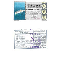 - Décimo da Lotaría Nacional de 1970 co motivo "O mar": imaxe que representa un trasatlántico. O número do décimo é o 38298 / ANVERSO. Impresión / 38298 / Lotería Nacional. Décima parte del billete para el sorteo del día 17 de noviembre de 1970 / El jefe del servicio (sinatura) / Cuarta / 38298 / 32/70 / 4ª / Precio 50 pesetas / 5ª serie / Trasatlántico (imaxe) / Fca. Nal. de Moneda y Timbre / REVERSO. Impresión / Sorteo del día 17 noviembre 1970. Sistema moderno. 10 series de 80.000 billetes de 500 pesetas. (Resumo de premios) / Extracto de la instrucción de Loterías (texto) / Próximo sorteo: 25 noviembre. Billetes de 500 ptas., en décimos de 50 ptas
