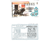 - Décimo da Lotaría Nacional de 1971 co motivo "A tauromaquia": imaxe que representa a saída do touro. O número do décimo é o 34645 / ANVERSO. Impresión / Lotería Nacional / 34645 / Décima parte del billete para el sorteo del día 5 de febrero de 1971 / El jefe del servicio (sinatura) / Décima / 34645 / 4/71 / 4ª serie / 10ª / Precio 50 pesetas / Salida del toro (imaxe) / Fca. Nal. de Moneda y Timbre / REVERSO. Impresión / Sorteo del día 5 de febrero 1971. Sistema moderno. 11 series de 80.000 billetes de 500 pesetas. (Resumo de premios) / Extracto de la instrucción de Loterías (texto) / próximo sorteo: 16 de febrero. Billetes de 1.000 ptas., en décimos de 100 ptas