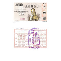 - Décimo "Especial de San Valentín" da Lotaría Nacional de 1971 co motivo "A tauromaquia": imaxe do toureiro Pepe-Hillo. O número do décimo é o 43060 / ANVERSO. Impresión / Lotería Nacional. Décima parte del billete para el sorteo del día 16 de febrero de 1971 / El jefe del servicio (sinatura) / 43060 / Novena / 43060 / 5/71 / 5ª serie / 9ª / Precio 100 pesetas / Pepe-Hillo (imaxe) / Fca. Nal. de Moneda y Timbre / REVERSO. Impresión / Sorteo del día 16 febrero 1971. Sistema moderno. 6 series de 100.000 billetes de 1.000 ptas. (Resumo de premios) / Extracto de la instrucción de Loterías (texto) / Próximo sorteo: 24 de febrero. Billetes de 500 ptas., en décimos de 50 ptas