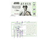 - Décimo da Lotaría Nacional de 1971 co motivo "A tauromaquia": imaxe do toureiro José Redondo "El Chiclanero". O número do décimo é o 46468 / ANVERSO. Impresión / Lotería Nacional / 46468 / Décima parte del billete para el sorteo del día 16 de abril de 1971 / El jefe del servicio (sinatura) / Quinta / 46468 / 12/71 / 6ª serie / 5ª / Precio 50 pesetas / El Chiclanero (imaxe) / Fca. Nal. de Moneda y Timbre / REVERSO. Impresión / Sorteo del día 16 de abril de 1971. Sistema moderno. 13 series de 60.000 billetes de 500 pesetas. (Resumo de premios) / Extracto de la instrucción de Loterías (texto) / Próximo sorteo: 27 de abril. Billetes de 500 ptas., en décimos de 50 ptas