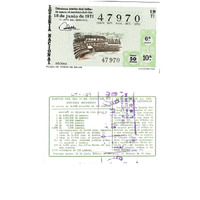 - Décimo da Lotaría Nacional de 1971 co motivo "A tauromaquia": imaxe que representa a praza de touros de Béjar. O número do décimo é o 47970 / ANVERSO. Impresión / Lotería Nacional. Décima parte del billete para el sorteo del día 18 de junio de 1971 / El jefe del servicio (sinatura) / 47970 / Décima / 47970 / 19/71 / 6ª serie / 10ª / Precio 50 pesetas / Plaza de toros de Béjar (imaxe) / Fca. Nal. de Moneda y Timbre / REVERSO. Impresión / Sorteo del día 18 de junio de 1971. Sistema moderno. 10 series de 60.000 billetes a 500 pesetas. (Resumo de premios) / Extracto de la instrucción de Loterías (texto) / Próximo sorteo: 25 de junio. Billetes de 500 ptas., en décimos de 50 ptas