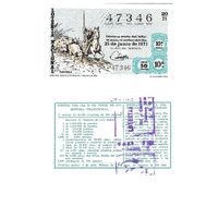 - Decimo da lotaría Nacional de 1971 co motivo "A tauromaquia": imaxe de temática taurina dun grupo escultórico de Benlliure. O número do décimo é o 47346 / ANVERSO. Impresión / Lotería Nacional / 47346 / Décima parte del billete para el sorteo del día 25 de junio de 1971 / El jefe del servicio (sinatura) / Décima / 47346 / 20/71 / 10ª serie / 10ª / Precio 50 pesetas / Grupo escultórico - Benlliure / Fca. Nal. de Moneda y TImbre / REVERSO. Impresión / Sorteo del día 25 de junio de 1971. Sistema tradicional. 11 series de 60.000 billetes de 500 pesetas. (Resumo de premios) / Extracto de la instrucción de Loterías (texto) / Próximo sorteo: 6 de julio. Billetes de 2.500 ptas., en décimos de 250 ptas