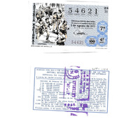- Décimo "Especial de Vacacións" da Lotaría Nacional de 1971 co motivo "A tauromaquia": imaxe que representa un encerro en Estella. O número do décimo é o 54621 / ANVERSO. Impresión / Lotería Nacional / 54621 / Décima parte del billete para el sorteo del día 5 de agosto de 1971 / El jefe del servicio (sinatura) / Séptima / 54621 / 24/71 / 7ª / 4ª serie / Precio 100 pesetas / Encierro en Estella (imaxe) / Fca. Nal. de Moneda y Timbre / REVERSO. Impresión / Sorteo del día 5 de agosto de 1971. Sistema moderno. Especial de vacaciones. 6 series de 100.000 billetes de 1.000 ptas. (Resumo de premios) / Extracto de la instrucción de Loterías (texto) / Próximo sorteo: 17 de agosto. Billetes de 500 pesetas, en décimos de 50 pesetas