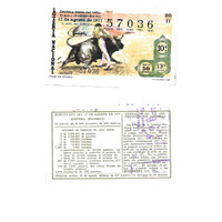 - Décimo da Lotaría Nacional de 1971 co motivo "A tauromaquia": imaxe que representa un "pase de pecho". O número do décimo é o 57036 / ANVERSO. Impresión / Lotería Nacional. Décima parte del billete para el sorteo del día 17 de agosto de 1971 / El jefe del servicio (sinatura) / 57036 / Décima / 57036 / 25/71 / 10ª / 13ª serie / Precio 50 pesetas / Pase de pecho (imaxe) / Fca. Nal. de Moneda y Timbre / REVERSO. Impresión / Sorteo del día 17 de agosto de 1971. Sistema moderno. 14 series de 60.000 billetes de 500 pesetas. (Resumo de premios) / Extracto de la instrucción de Loterías (texto) / Próximo sorteo: 25 de agosto. Billetes de 500 pesetas, en décimos de 50 pesetas