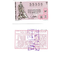 - Décimo da Lotaría Nacional de 1971 co motivo "A tauromaquia": imaxe do toureiro Manuel Laureano Rodríguez Sánchez "Manolete". O número do décimo é o 55556 / ANVERSO. Impresión / Lotería Nacional / 55556 / Décima parte del billete para el sorteo del día 25 de agosto de 1971 / El jefe del servicio (sinatura) / Novena / 55556 / 26/71 / 9ª / 7ª serie / Precio 50 pesetas / Manolete (imaxe) / Fca. Nal. de Moneda y Timbre / REVERSO. Impresión / Sorteo del día 25 de agosto de 1971. Sistema moderno. 10 series de 80.000 billetes de 500 pesetas. (Resumo de premios) / Extracto de la instrucción de Loterías (texto) / Próximo sorteo: 7 septiembre. Billetes de 2.500 ptas., en décimos de 250 ptas