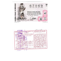 - Décimo da Lotaría Nacional de 1971 co motivo "A tauromaquia": imaxe do toureiro Salvador Sánchez Povedano "Frascuelo".O número do décimo é o 67069 / ANVERSO. Impresión / Lotería Nacional / 67069 / Décima parte del billete para el sorteo del día 14 de septiembre de 1971 / El jefe del servicio (sinatura) / Cuarta / 67069 / 28/71 / 4ª / 7ª serie / Precio 50 pesetas / Frascuelo / Fca. Nal. de Moneda y Timbre / REVERSO. Impresión / Sorteo del día 14 septiembre 1971. Sistema moderno. 11 series de 80.000 billetes de 500 pesetas. (Resumo de premios) / Extracto de la instrucción de Loterías (texto) / Próximo sorteo: 21 septiembre. Billetes de 500 ptas., en décimos de 50 ptas
