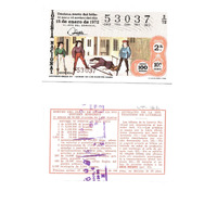 - Décimo da Lotaría Nacional de 1972 co motivo "O neno na arte española": imaxe que representa unha copia do anónimo do s. XV "El juego de los zancos". O número do décimo é o 53037 / ANVERSO. Impresión / Lotería Nacional. Décima parte del billete para el sorteo del día 15 de enero de 1972 / El jefe del servicio (sinatura) / 53037/ Segunda / 53037 / 2/72 / 2ª / 10ª serie / Precio 100 pesetas / Anónimo siglo XV - "Juego de los zancos" (copia) (imaxe) / Fca. Nal. de Moneda y Timbre / REVERSO. Impresión / Sorteo del día 15 de enero de 1972. Sistema moderno. 11 series de 60.000 billetes de 1.000 pesetas. (Resumo de premios) / Extracto de la instrucción de Loterías (texto) / Próximo sorteo: 25 de enero. Billete de 500 ptas., en décimos de 50 ptas