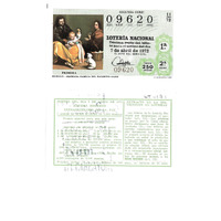 - Décimo "Extraordinario da Paz" da Lotaría Nacional de 1972 co motivo "O neno na arte española": imaxe que representa unha copia da obra de Murillo "Sagrada Familia del pajarito". O número do décimo é o 09620 / ANVERSO. Impresión / SEGUNDA SERIE / 09620 / Lotería Nacional. Décima parte del billete para el sorteo del día 7 de abril de 1972 / El jefe del servicio (sinatura) / Primera / 09620 / 11/72 / 1ª / 2ª serie / Precio 250 pesetas / Murillo - "Sagrada Familia del pajarito" (copia) (imaxe) / Fca. Nal. de Moneda y Timbre / REVERSO. Impresión / Sorteo del día 7 de abril. Sistema moderno. Extraordinario de la Paz. 5 series de 70.000 billetes de 2.500 pesetas. (Resumo de premios) / Extracto de la instrucción de Loterías (texto) / Próximo sorteo: 18 de abril. Billetes de 500 ptas., en décimos de 50 ptas