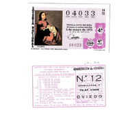 - Décimo "Extraordinario de Maio" da Lotaría Nacional de 1972 co motivo "O neno na arte española": imaxe que representa unha copia da obra de Zurbarán "La virgen niña rezando". O número do décimo é o 04033 / ANVERSO. Impresión / Lotería Nacional / 04033 / Décima parte del billete para el sorteo del día 5 de mayo de 1972 / El jefe del servicio (sinatura) / Cuarta / 04033 / 14/72 / 4ª / 4ª serie / Precio 250 pesetas / Zurbarán - "La virgen niña rezando" (copia) (imaxe) / Fca. Nal. de Moneda y Timbre / REVERSO. Impresión / Sorteo del día 5 de mayo de 1972. Sistema moderno. Extraordinario de mayo. 5 series de 60.000 billetes de 2.500 pesetas. (Resumo de premios) / Extracto de la instrucción de Loterías (texto) / Próximo sorteo: 12 de mayo. Billetes de 500 ptas., en décimos de 50 ptas