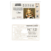- Décimo da Lotaría Nacional de 1972 co motivo "O neno na arte española": imaxe que representa unha copia da obra de Velázquez "La infanta Margarita". O número do décimo é o 53304 / ANVERSO. Impresión / Lotería Nacional. Décima parte del billete para el sorteo del día 15 de julio de 1972 / El jefe del servicio (sinatura) / Octava / 53304 / 23/72 / 8ª / 14ª serie / Precio 50 pesetas / Velázquez - "La infanta Margarita" (copia) (imaxe) / Fca. Nal. de Moneda y Timbre / REVERSO. Impresión / Sorteo del día 15 de julio de 1972. Sistema moderno. 14 series de 60.000 billetes de 500 pesetas. (Resumo de premios) / Extracto de la instrucción de Loterías (texto) / Próximo sorteo: 26 de julio. Billetes de 500 ptas., en décimos de 50 ptas