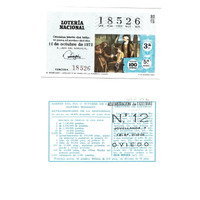 - Décimo "Extraordinario da Hispanidade" da Lotaría Nacional de 1972 co motivo "O neno na arte española": imaxe que representa unha copia da obra de Benito Mercadé "Colón y su hijo en La Rábida". O número do décimo é o 18526 / ANVERSO. Impresión / Lotería Nacional. Décima parte del billete para el sorteo del día 11 de octubre de 1972 / El jefe del servicio (sinatura) / 18526 / Tercera / 18526 / 32/72 / 3ª / 5ª serie / Precio 100 pesetas / B. Mercadé - "Colón y su hijo en La Rábida" (copia) (imaxe) / Fca. Nal. de Moneda y Timbre / REVERSO. Impresión / Sorteo del día 11 de octubre de 1972. Sistema moderno. Extraordinario de la Hispanidad. 10 series de 60.000 billetes de 1.000 ptas. (Resumo de premios) / Extracto de la instrucción de Loterías (texto) / Próximo sorteo: 18 octubre. Billetes de 500 ptas., en décimos de 50 ptas