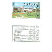 - Décimo "Especial de San Valentín" da Lotaría Nacional de 1973 co motivo "España medra": imaxe que representa a residencia de anciáns Francisco Franco de Madrid. O número do décimo é o 53753 / ANVERSO. Impresión / (Escudo) / 53753 / Lotería Nacional. Décima parte del billete para el sorteo del día 15 de febrero de 1978 / El jefe del servicio (sinatura) / Segunda / 53753 / 5/73 / 2ª / 2ª serie / Precio 150 pesetas / "Residencia de ancianos Francisco Franco". Madrid (imaxe) / Fca. Nal. de Moneda y Timbre / REVERSO. Impresión / Sorteo del día 15 de febrero de 1973. Sistema moderno. Especial de San Valentín. 6 series de 100.000 billetes de 1.500 pesetas. (Resumo de premios) / Extracto de la instrucción de Loterías (texto) / Próximo sorteo: 27 de febrero. Billetes de 500 ptas., en décimos de 50 ptas