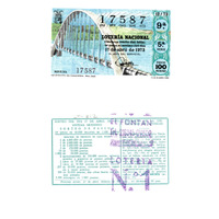 - Décimo da Lotaría Nacional de 1973, sorteo de Pascua, co motivo "España medra": imaxe que representa o acueducto de Calancha, do "Plan Xaén". O número do décimo é o 17587 / ANVERSO. Impresión / (Escudo) / 17587 / Lotería Nacional. Décima parte del billete para el sorteo del día 17 de abril de 1973 / El jefe del servicio (sinatura) / Novena / 17587 / 12/73 / 9ª / 5ª serie / Precio 100 pesetas / "Acueducto de Calancha". Plan Jaén (imaxe) / Fca. Nal. de Moneda y Timbre / REVERSO. Impresión / Sorteo del día 17 de abril de 1973. Sistema moderno. Sorteo de Pascua. 10 series de 60.000 billetes de 1.000 pesetas. (Resumo de premios) / Extracto de la instrucción de Loterías (texto) / Próximo sorteo: 27 de abril. Billetes de 500 ptas., en décimos a 50 ptas