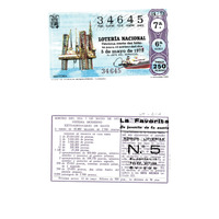 - Décimo "Extraordinario de Maio" da Lotaría Nacional de 1973 co motivo "España medra": imaxe que representa unha torre de sondaxes petrolíferos en Tarragona. O número do décimo é o 34645 / ANVERSO. Impresión / (Escudo) / 34645 / Lotería Nacional. Décima parte del billete para el sorteo del día 5 de mayo de 1973 / El jefe del servicio (sinatura) / Séptima / 34645 / 14/73 / 7ª / 6ª serie / Precio 250 pesetas / "Torre de sondeos petrolíferos". Tarragona (imaxe) / Fca. Nal. de Moneda y Timbre / REVERSO. Impresión / Sorteo del día 5 de mayo de 1973. Sistema moderno. Extraordinario de mayo. 6 series de 60.000 billetes de 2.500 pesetas. (Resumo de premios) / Extracto de la instrucción de Loterías (texto) / Próximo sorteo: 12 de mayo. Billetes de 500 ptas., en décimos de 50 ptas